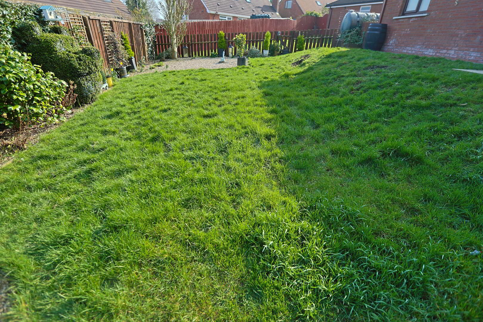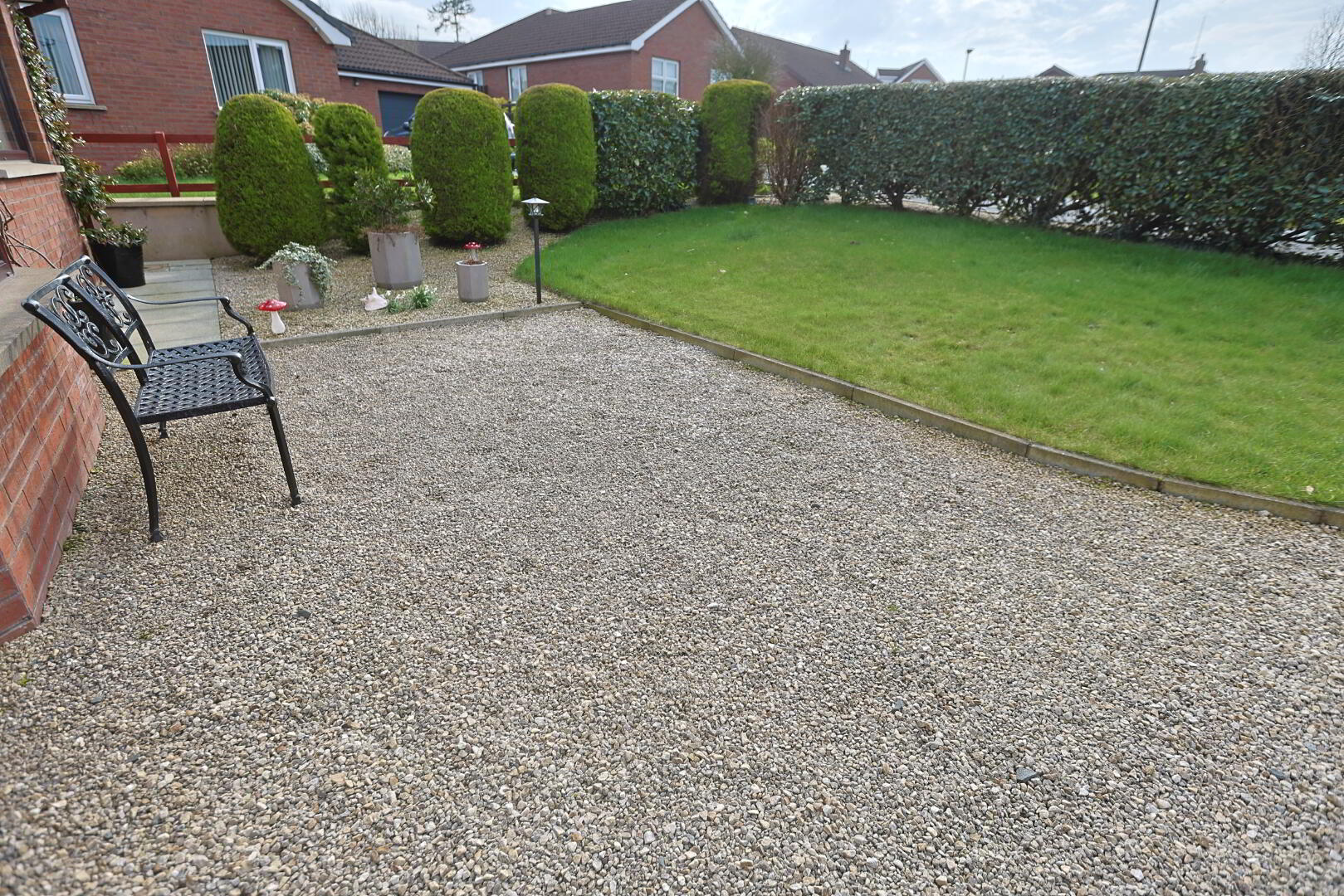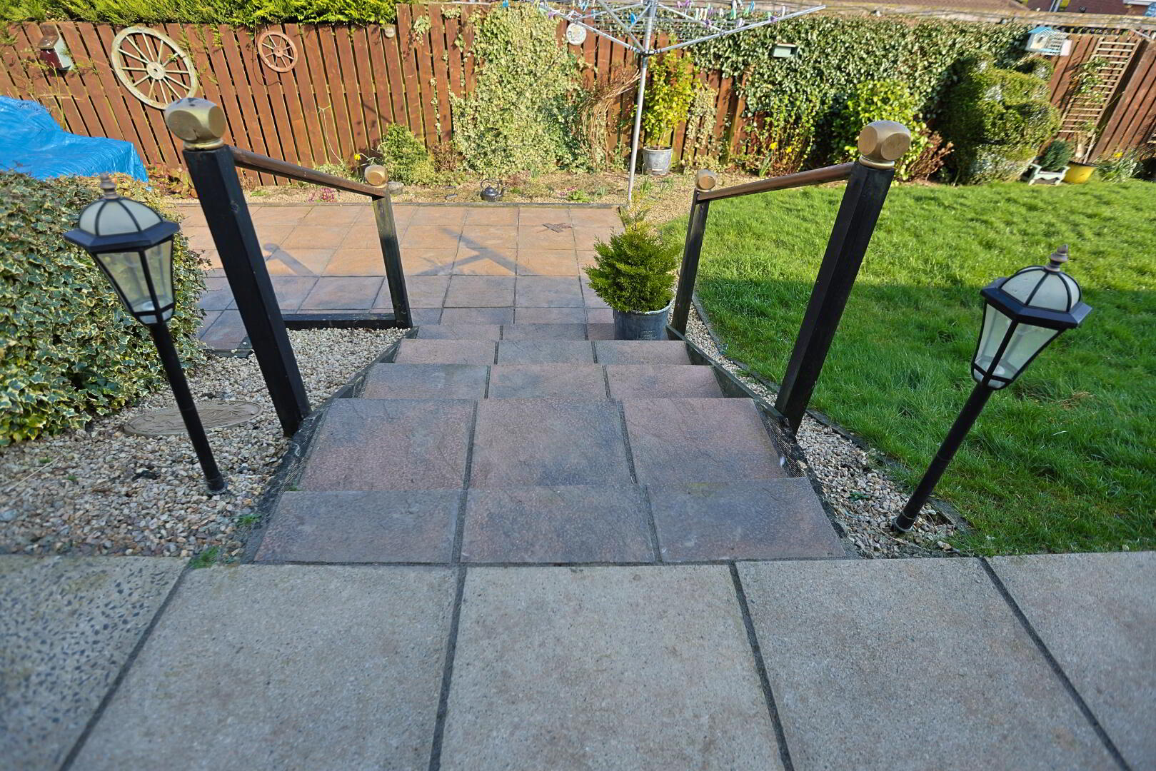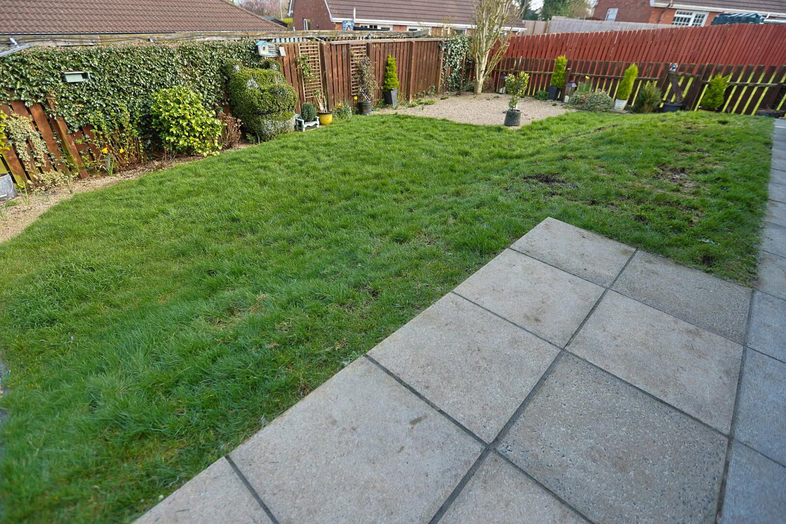 Rear garden laid in lawn, patio and pebbled areas for low maintenance