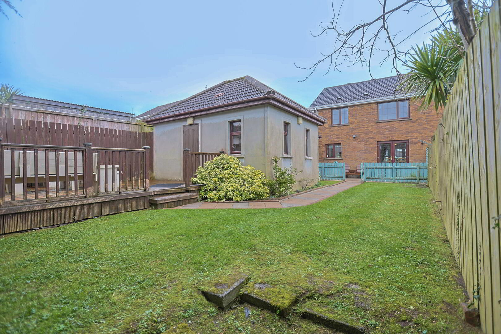 Private rear garden laid in lawn with patio, outbuilding ideal for home office/salon/running business front garden laid in lawn with tarmac driveway