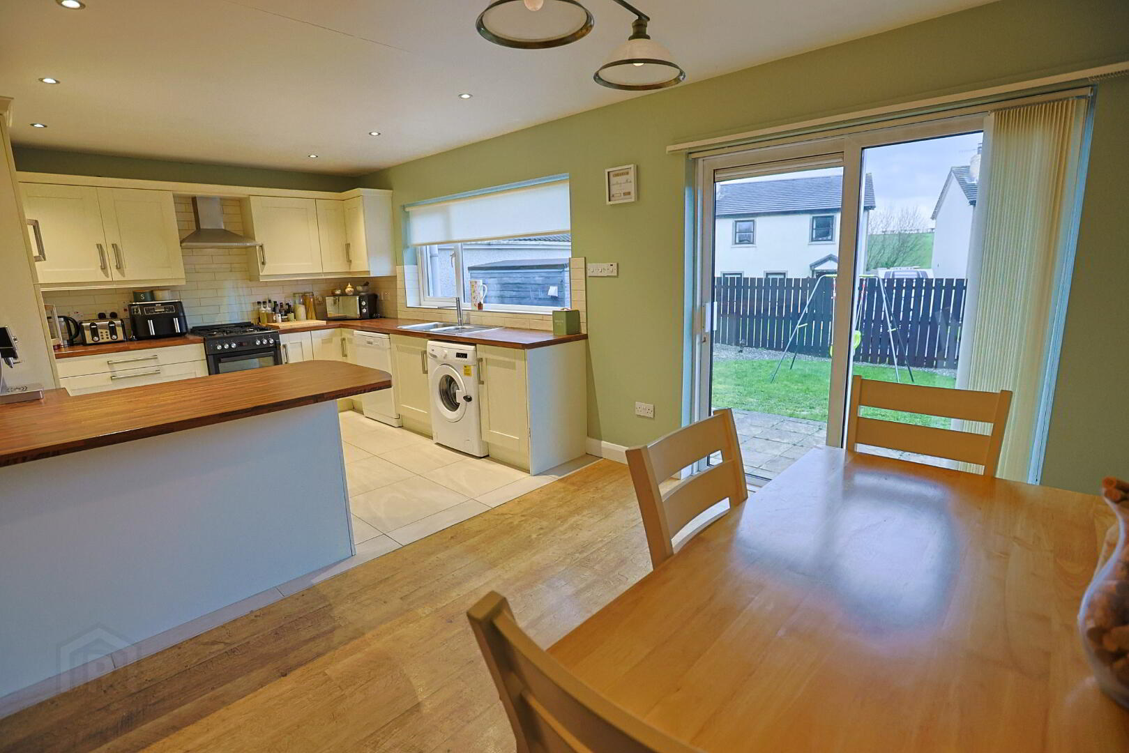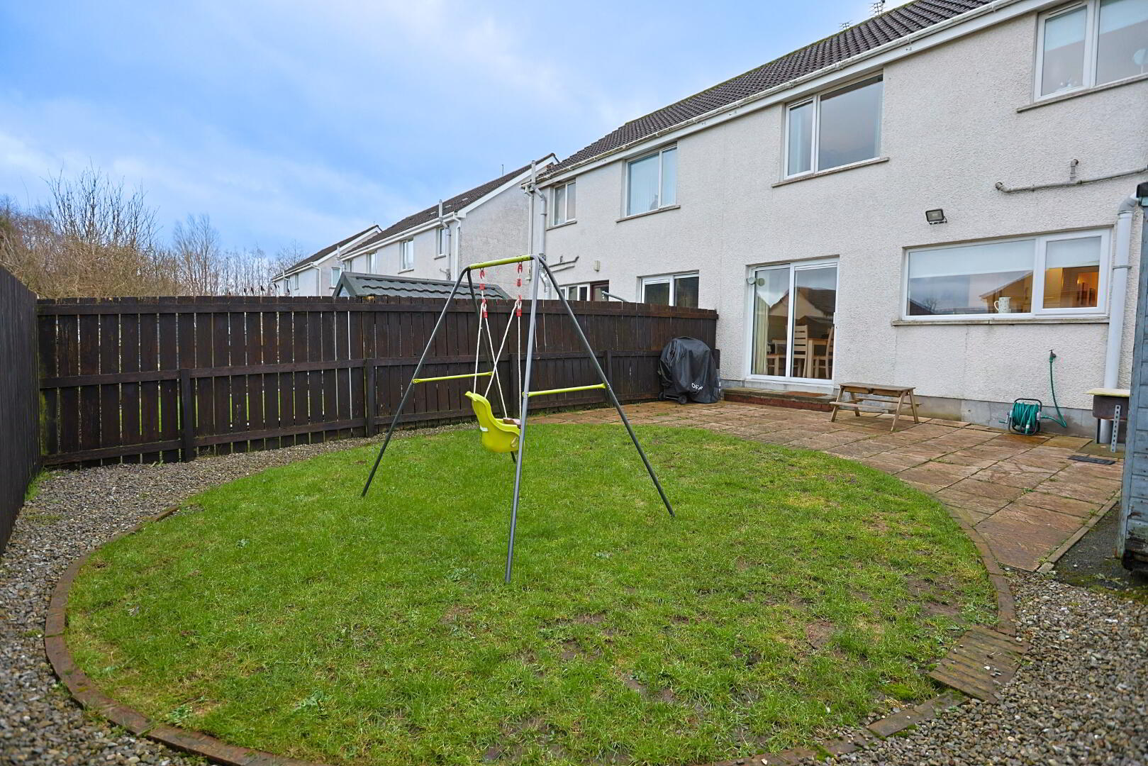 rear garden laid in patio, lawn and pebbled area