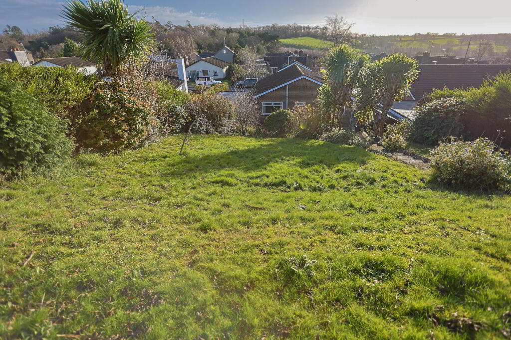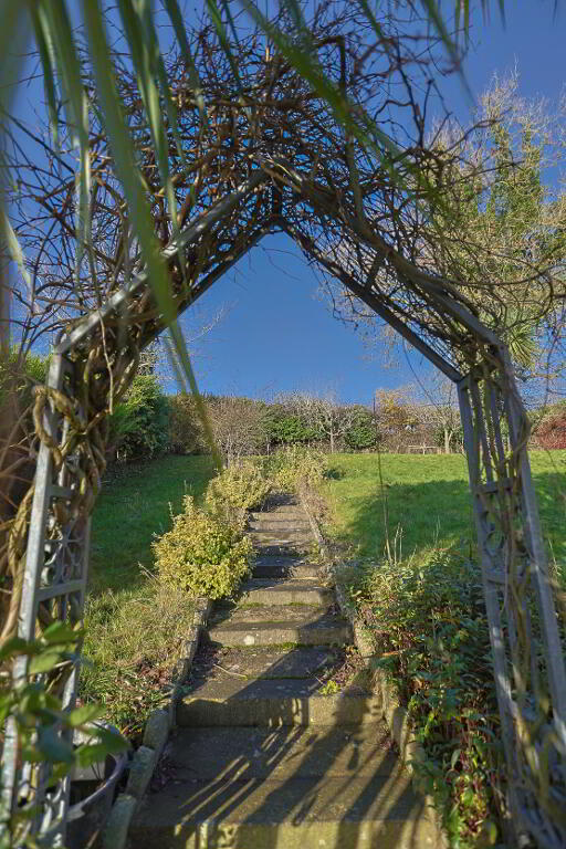 Front garden laid in lawn, a long tarmac driveway and garage landscaped private garden laid in lawn with mature shrubs and trees.