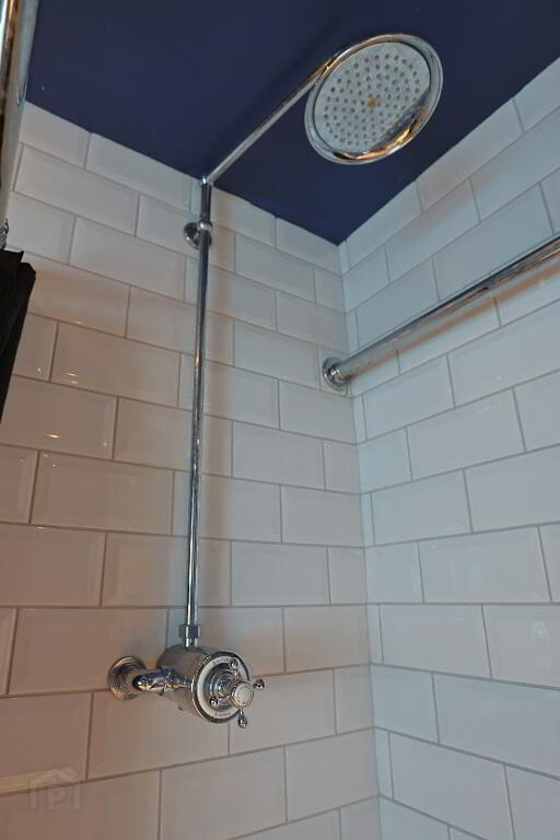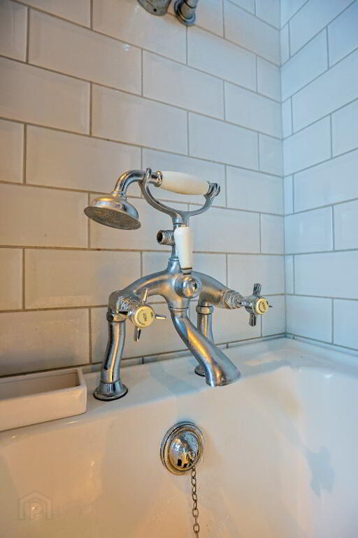 freestanding bath with telephone style shower attachment and rain head shower over bath
