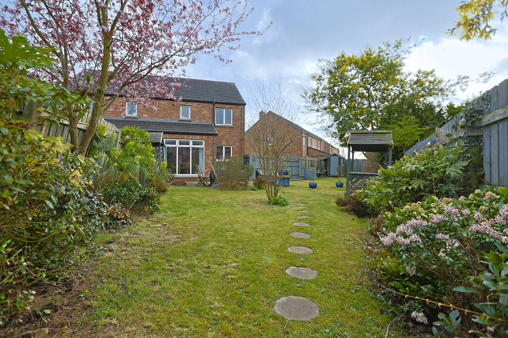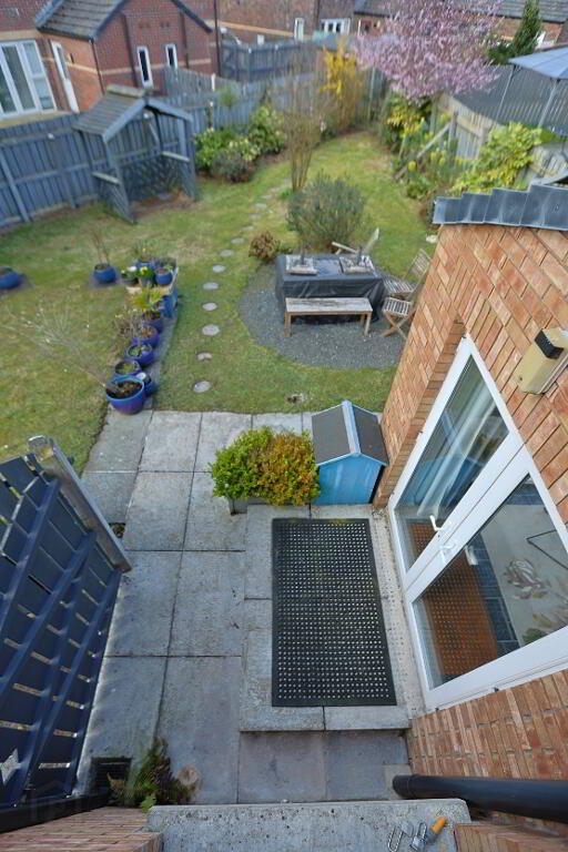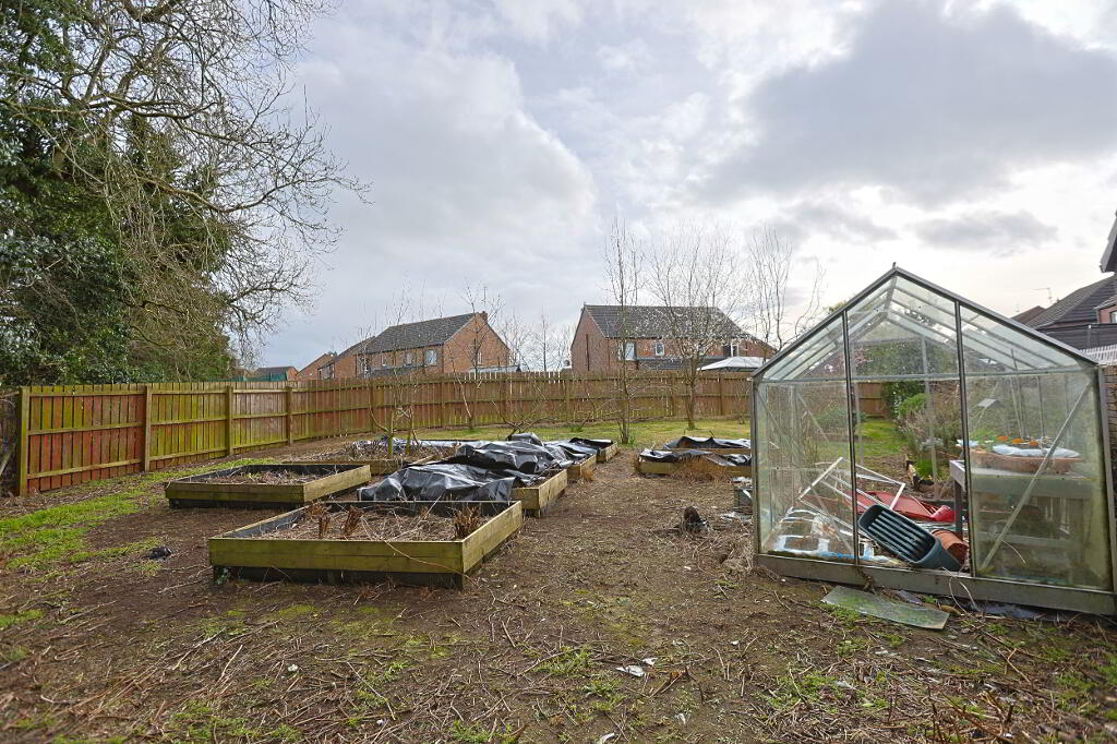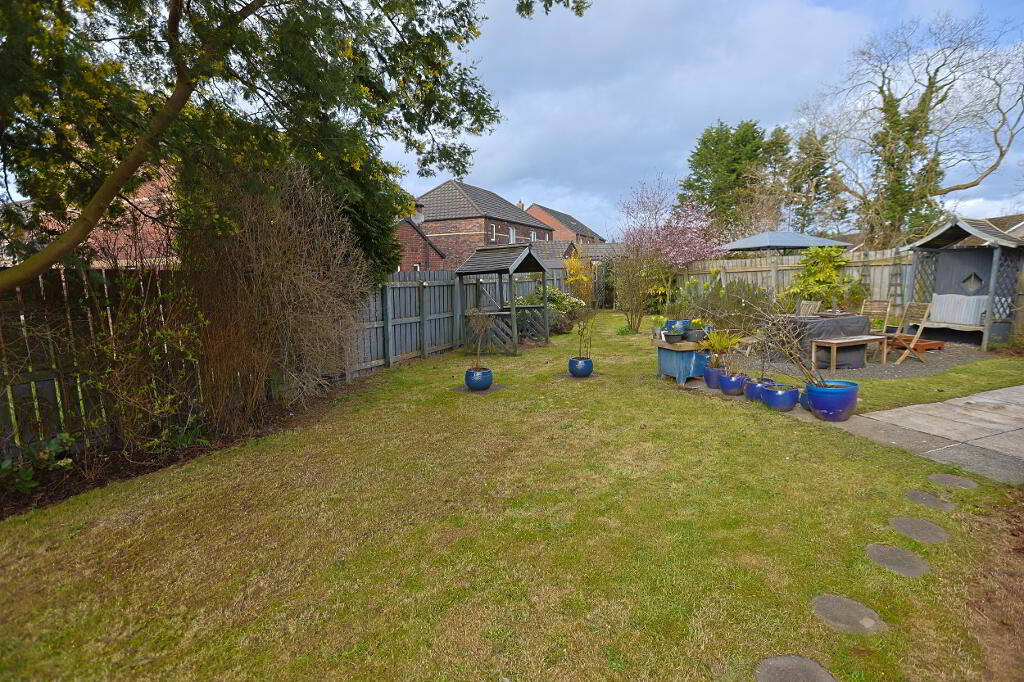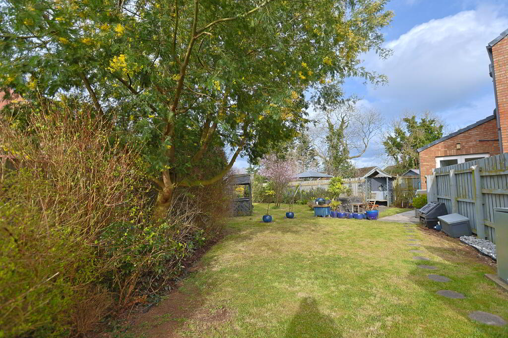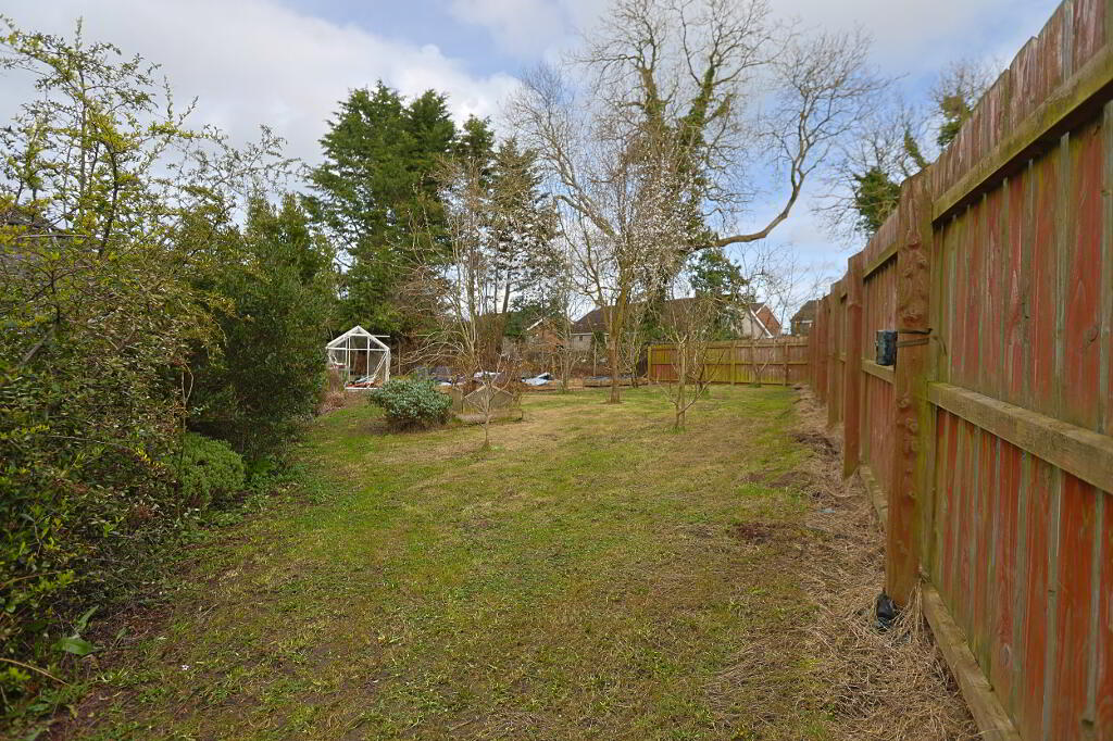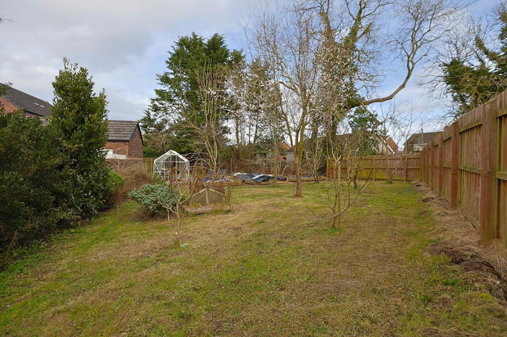 exceptionally spacious rear garden laid in lawn, patio, mature shrubs and fruit trees