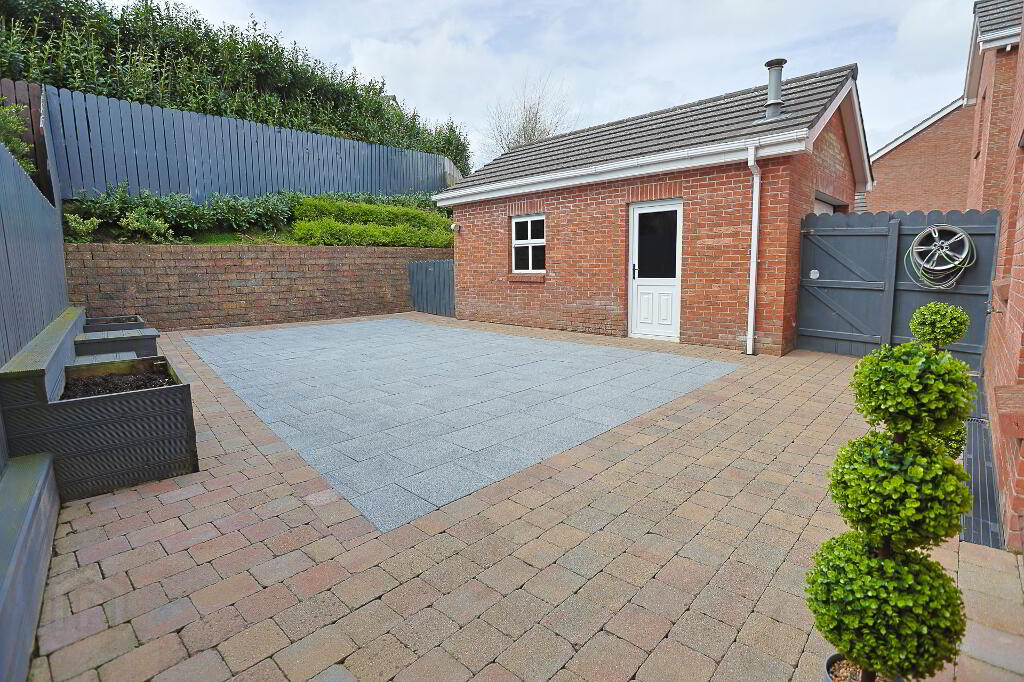 Private rear garden laid in lawn, luxury patio and raised flower beds