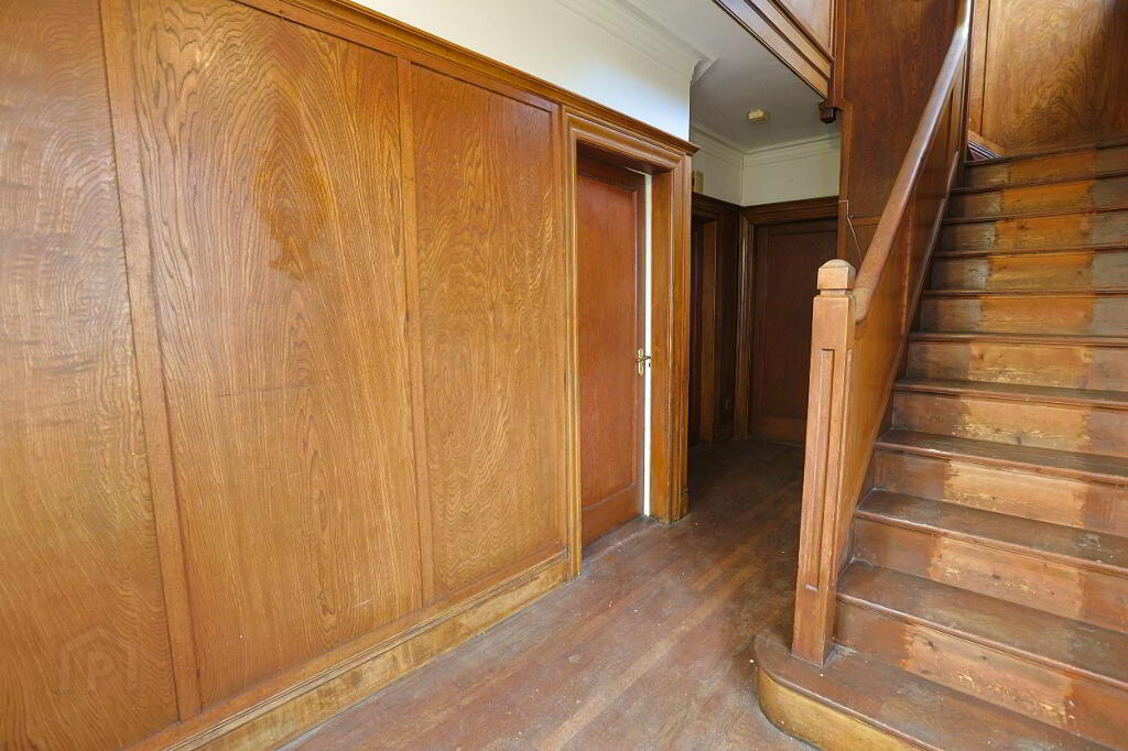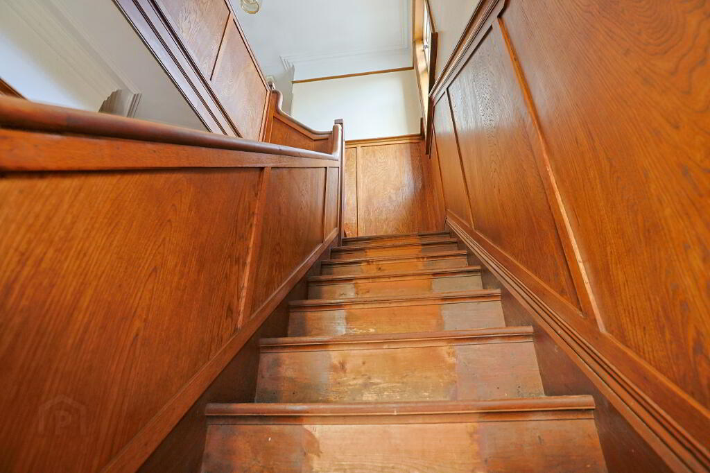 Feature wood panelling on walls and staircase