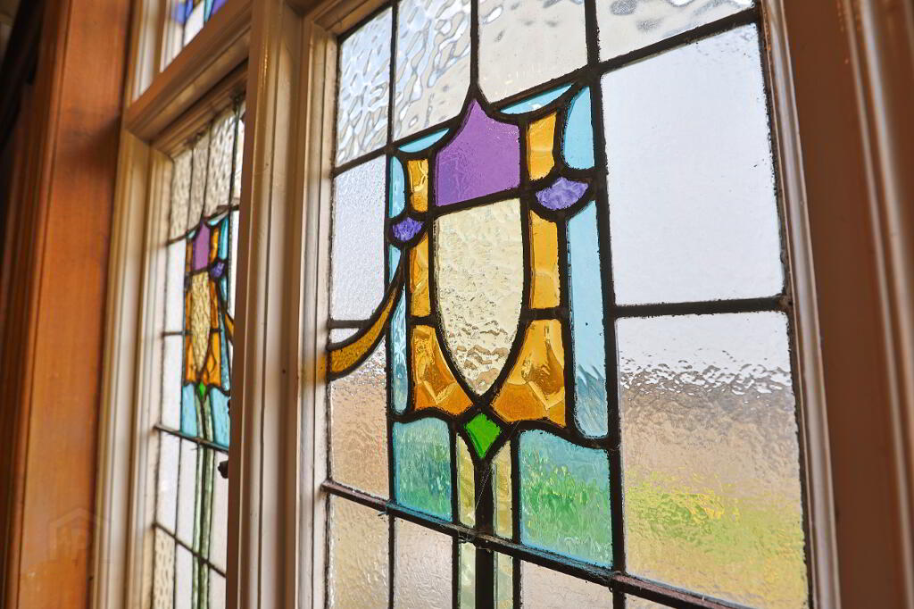 Wood panel and stained glass front door